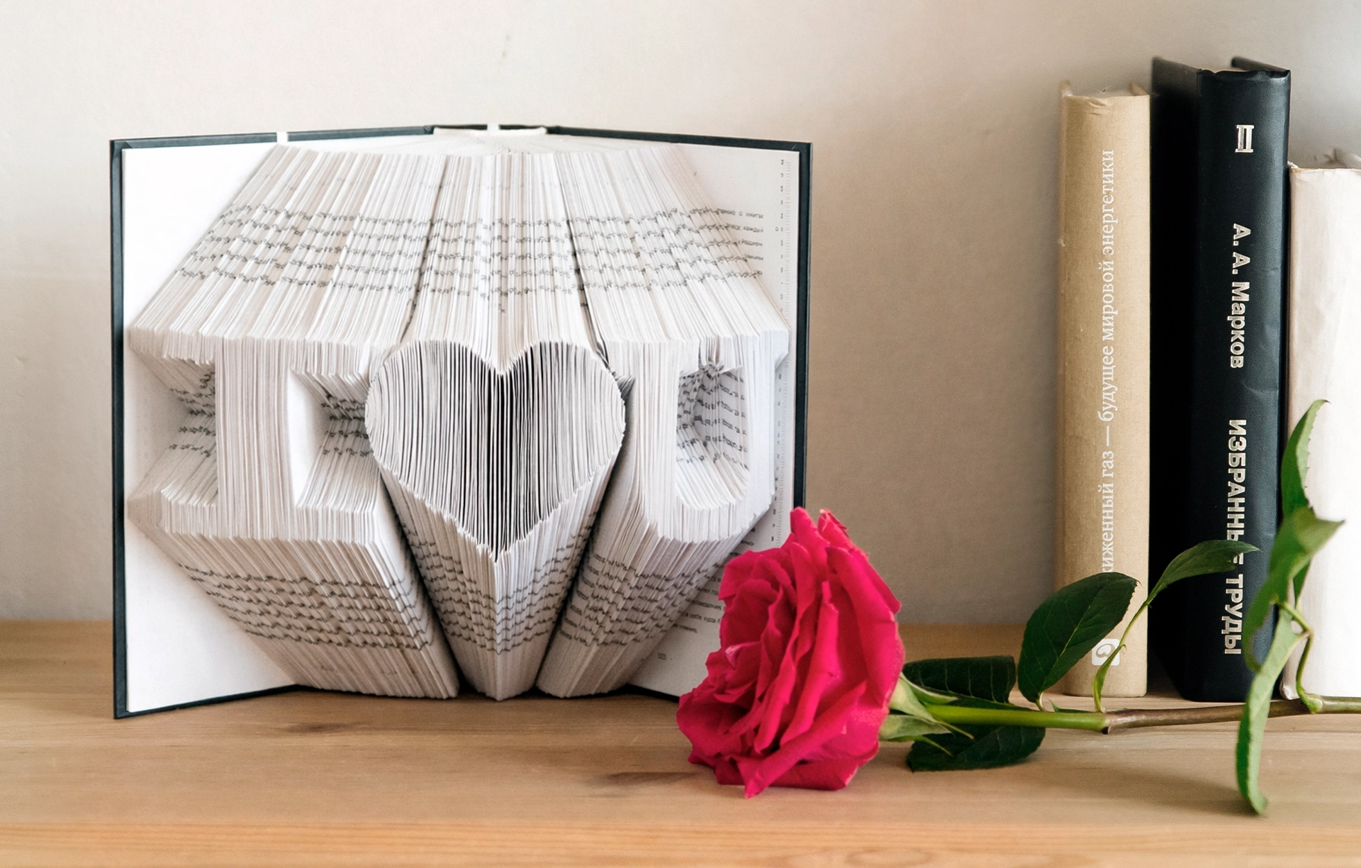 Складывание страниц — это оригинальный и творческий способ превратить ненужную книжку в бумажный арт-объект. Такое направление, как поделки из книг: складывание страниц, известно во всем мире под названием book folding или букфолдинг. В основе техники — аккуратно сложить каждый лист, складывать страницы пополам или под углом, следуя пошаговой схеме, чтобы на срезе книги появился объемный рисунок, буква, цветок или памятный символ.